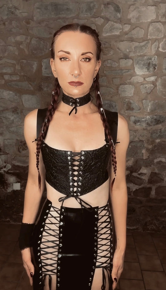 The Phoenix collection is a rebirth for Eustratia, expanding on the brand’s root concept of duality and integration of historically inspired pieces by reimagining modern luxury from an alternative style perspective. Bringing back the elements of DIY and customisation that were integral to the rise of punk and goth fashion, in an elevated way. Combining a bespoke service with options for customisation allows the wearer to have creative agency over their look, while benefitting from expert craftsmanship. The looks in this collection are inspired by female archetypes. They can be layered, dismantled and rearranged to create a variety of combinations.
