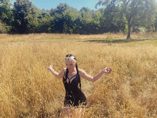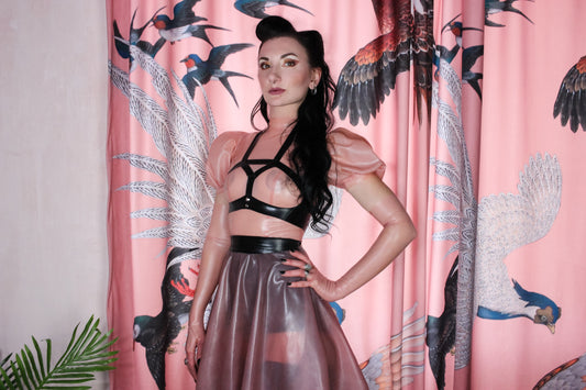 Low back latex dress sample in metallic fuchsia, size small, ready to ship!
