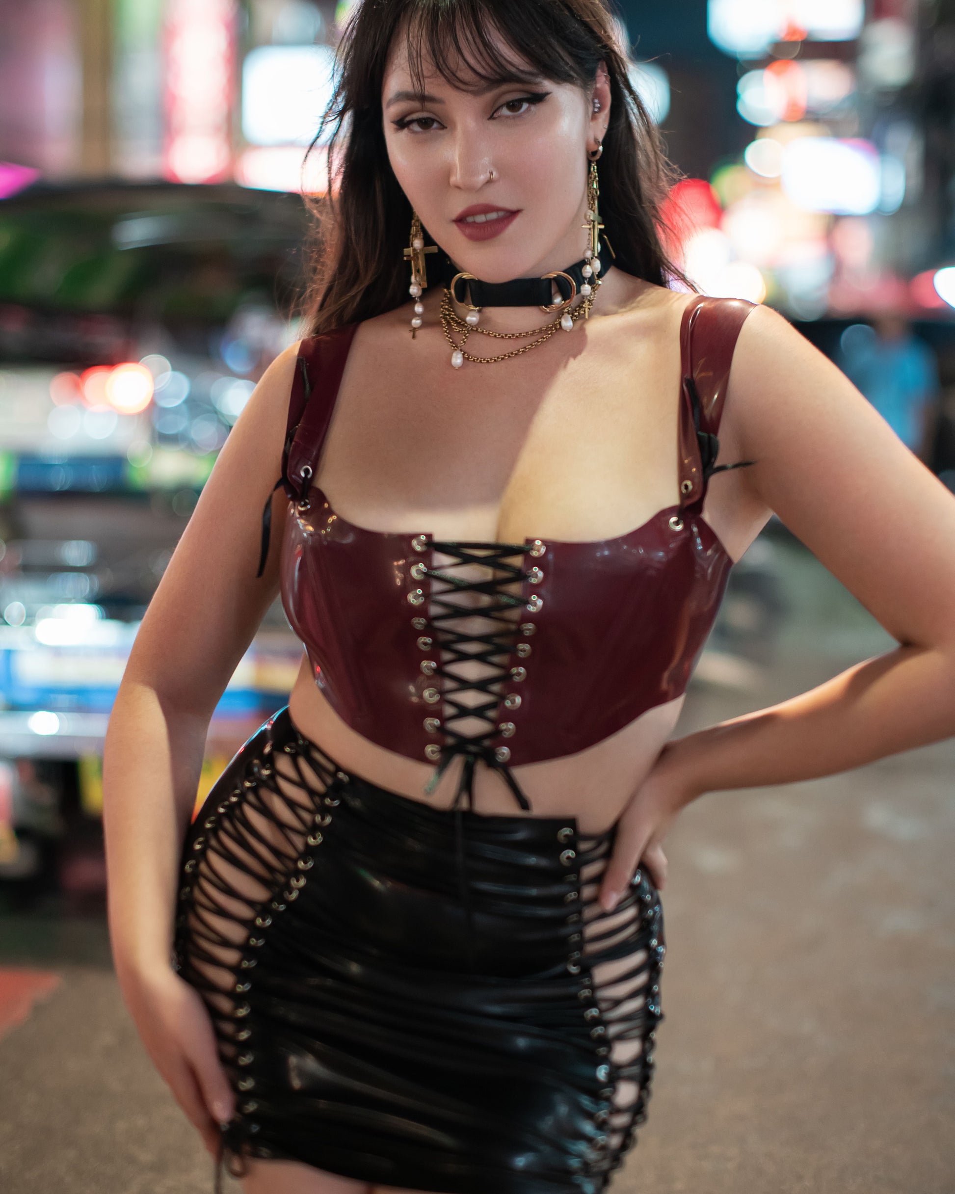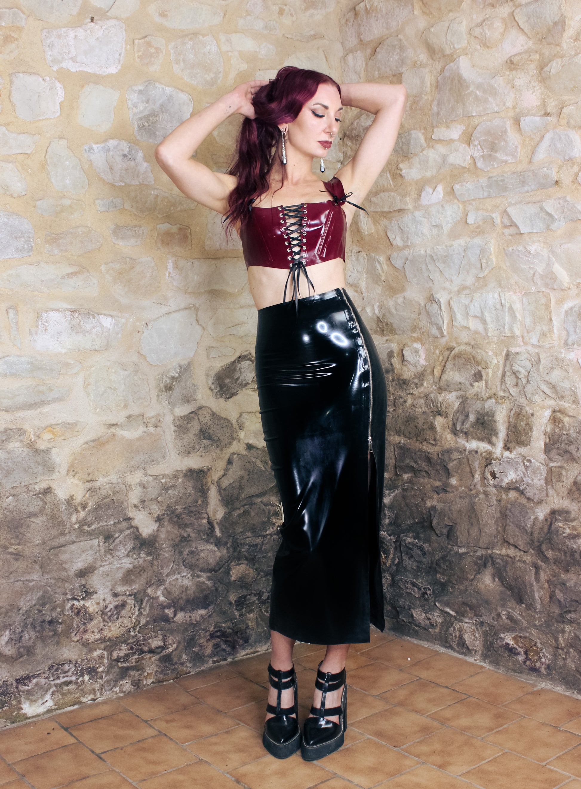 Cropped, corset style top with lace-up detail to the front and back. Boned only on the front to retain the structured look while remaining comfortable and allowing for full range of movement. The perfect top for concerts and festivals! Made from standard grade plates (thicker grade reinforcement on boning) and available in all latex colours.