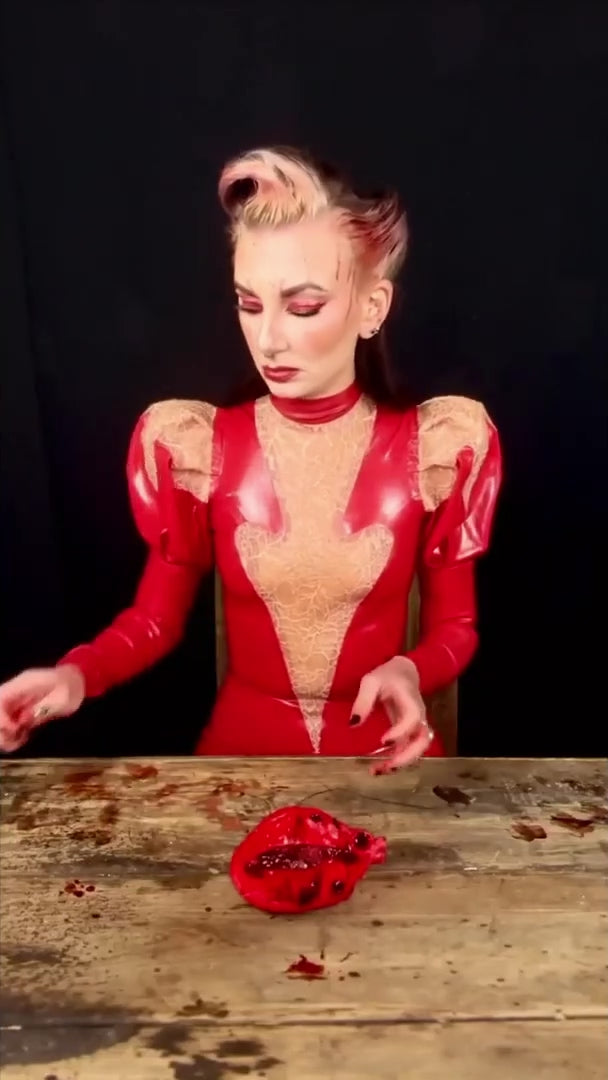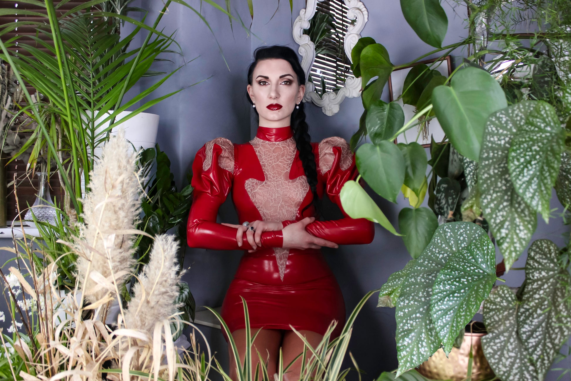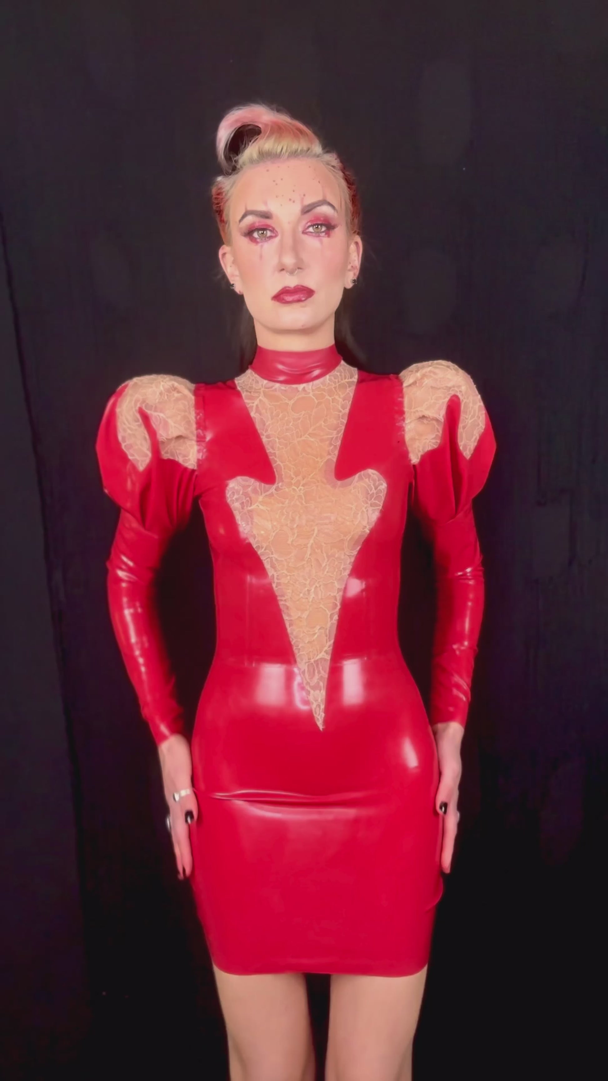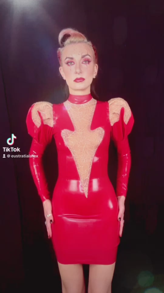 Erato puff sleeve latex dress with latex-lace details