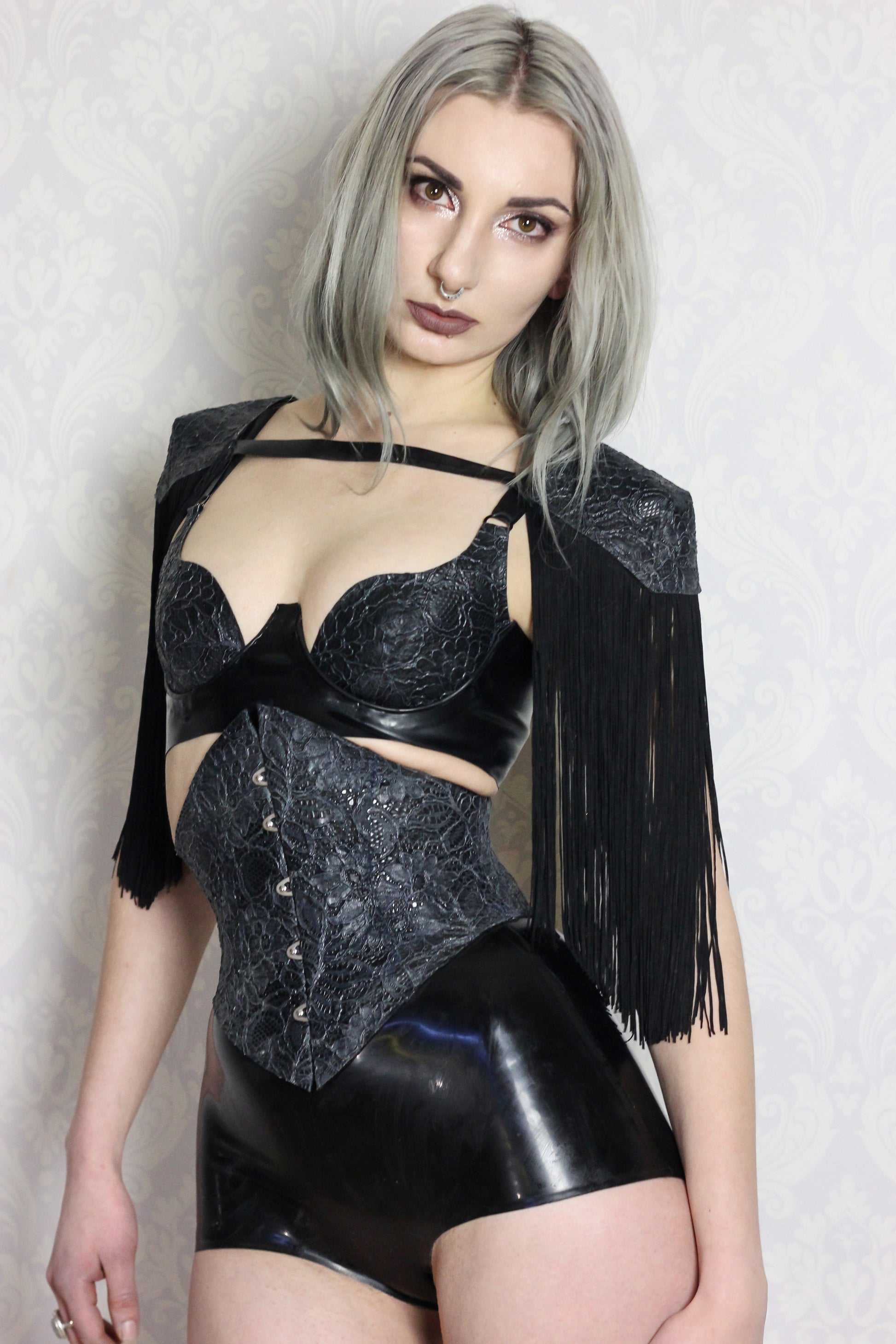 Our best selling fringe shoulder pads, now in textured latex-lace