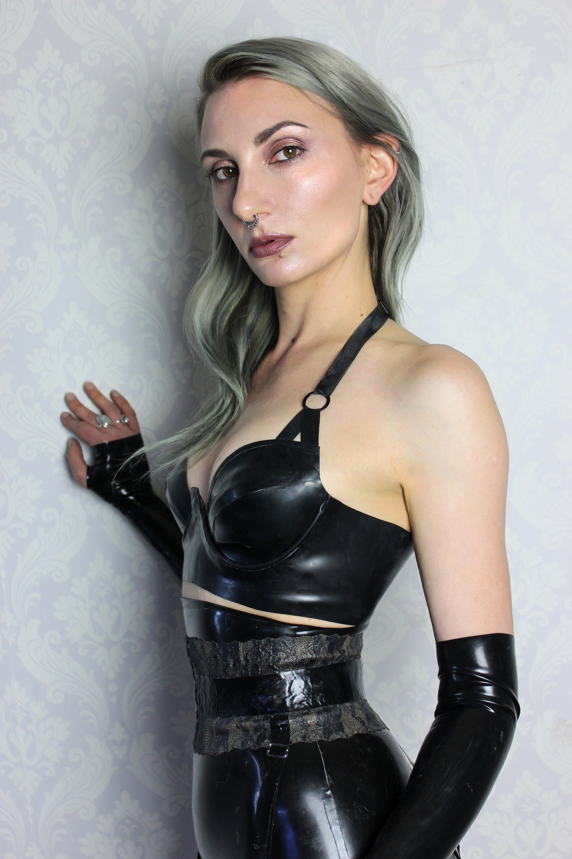 Latex halter neck plunge bra with underwires and adjustable strap.