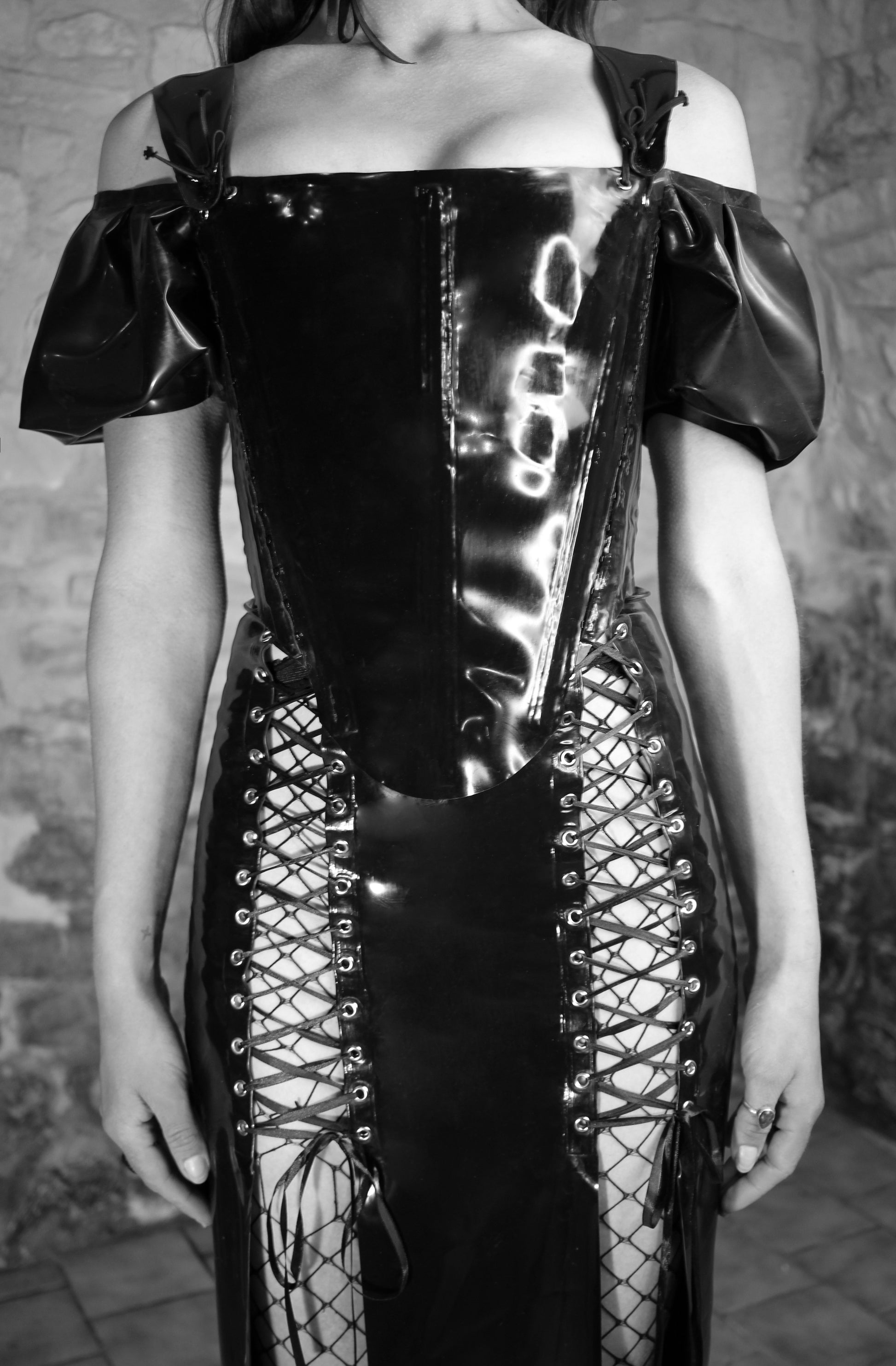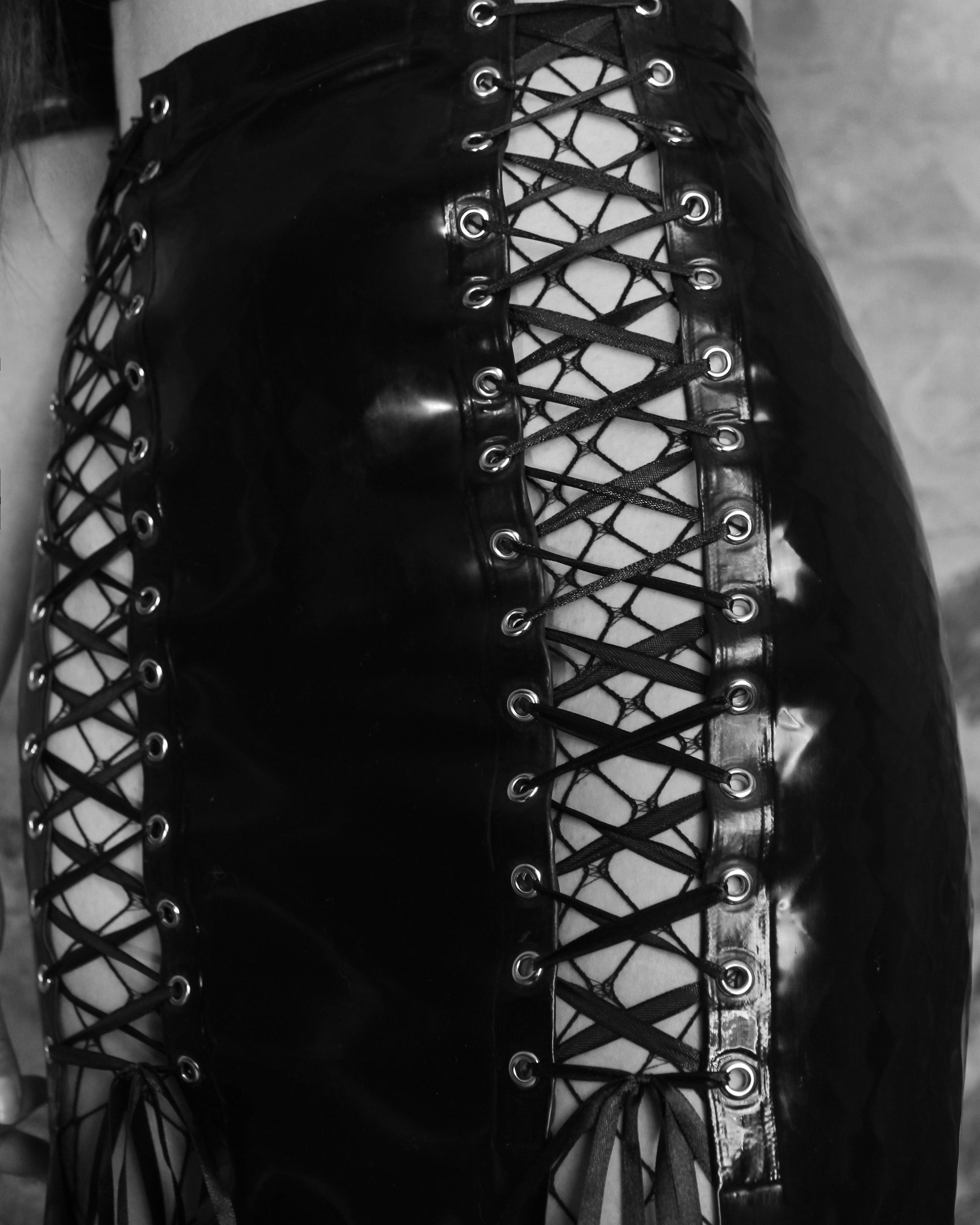The Lilith lace-up latex skirt is a long, paneled latex skirt featuring ribbon-laced eyelets that create a striking effect between the panels, while allowing for size adjustment. There is also a zipper at the back for ease of dressing.