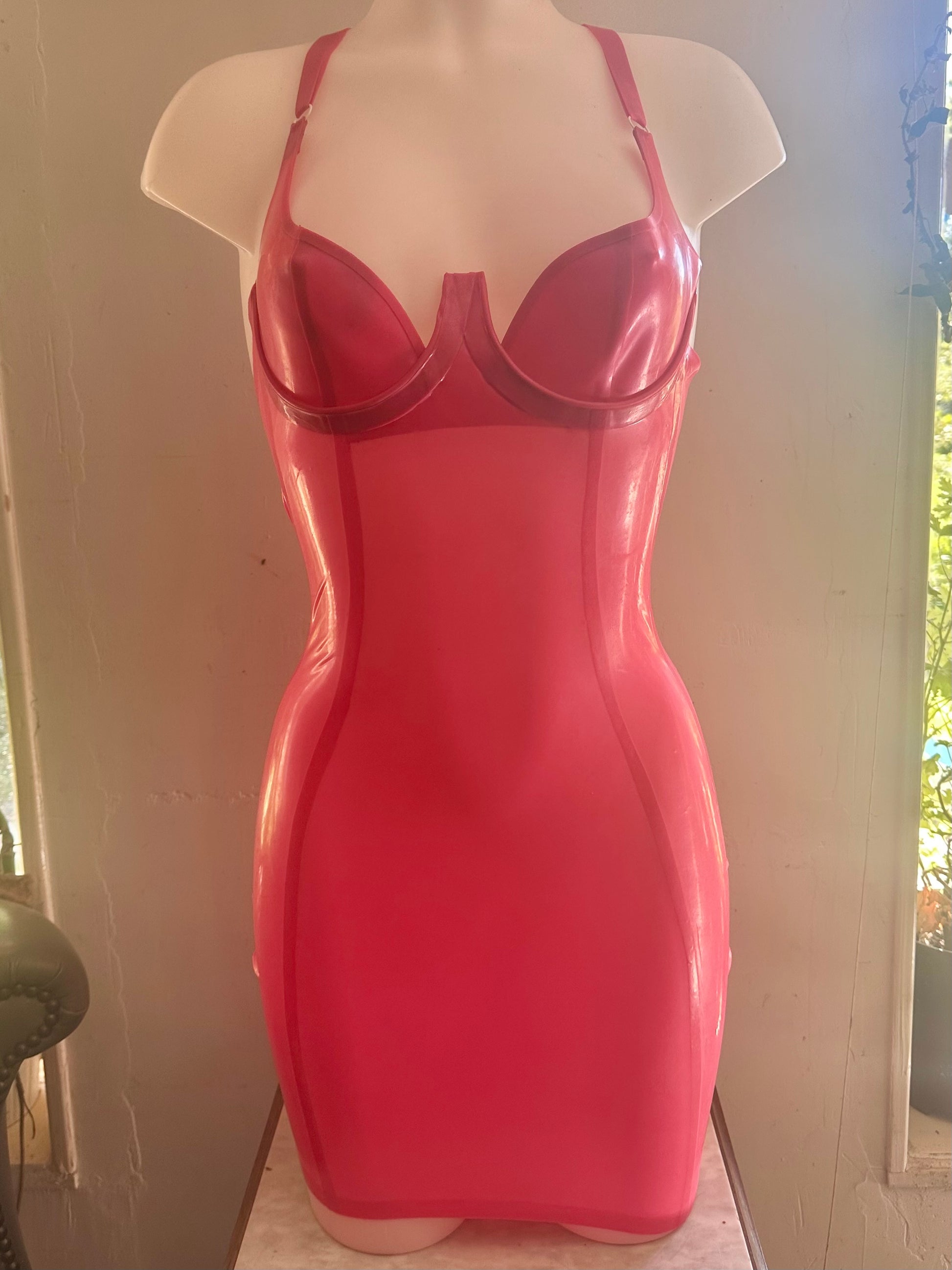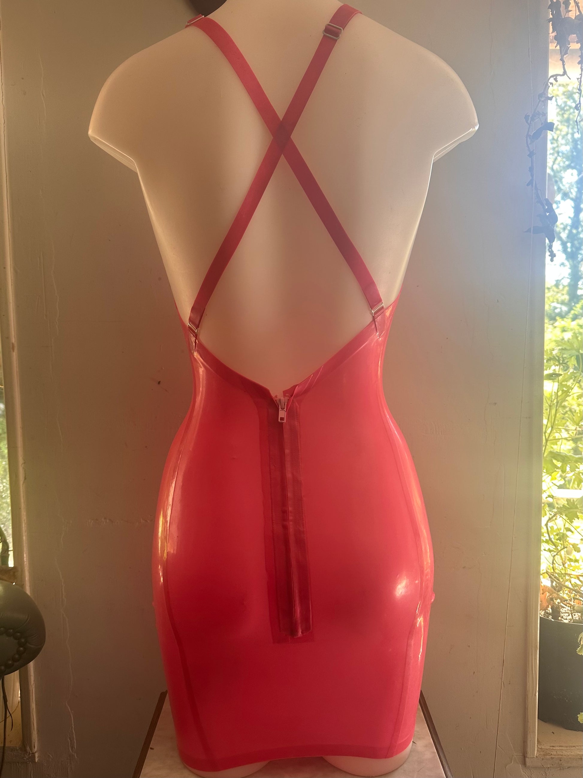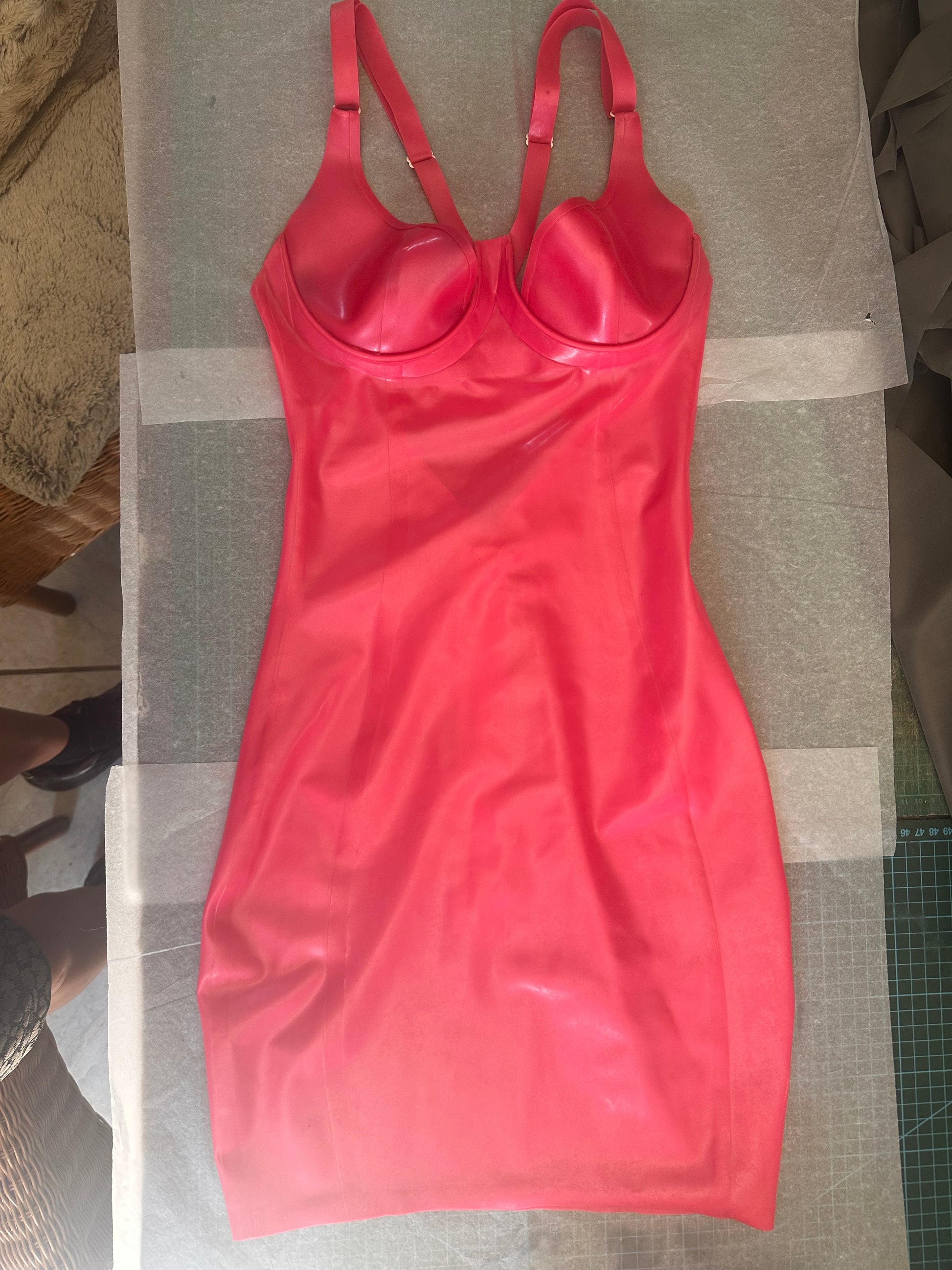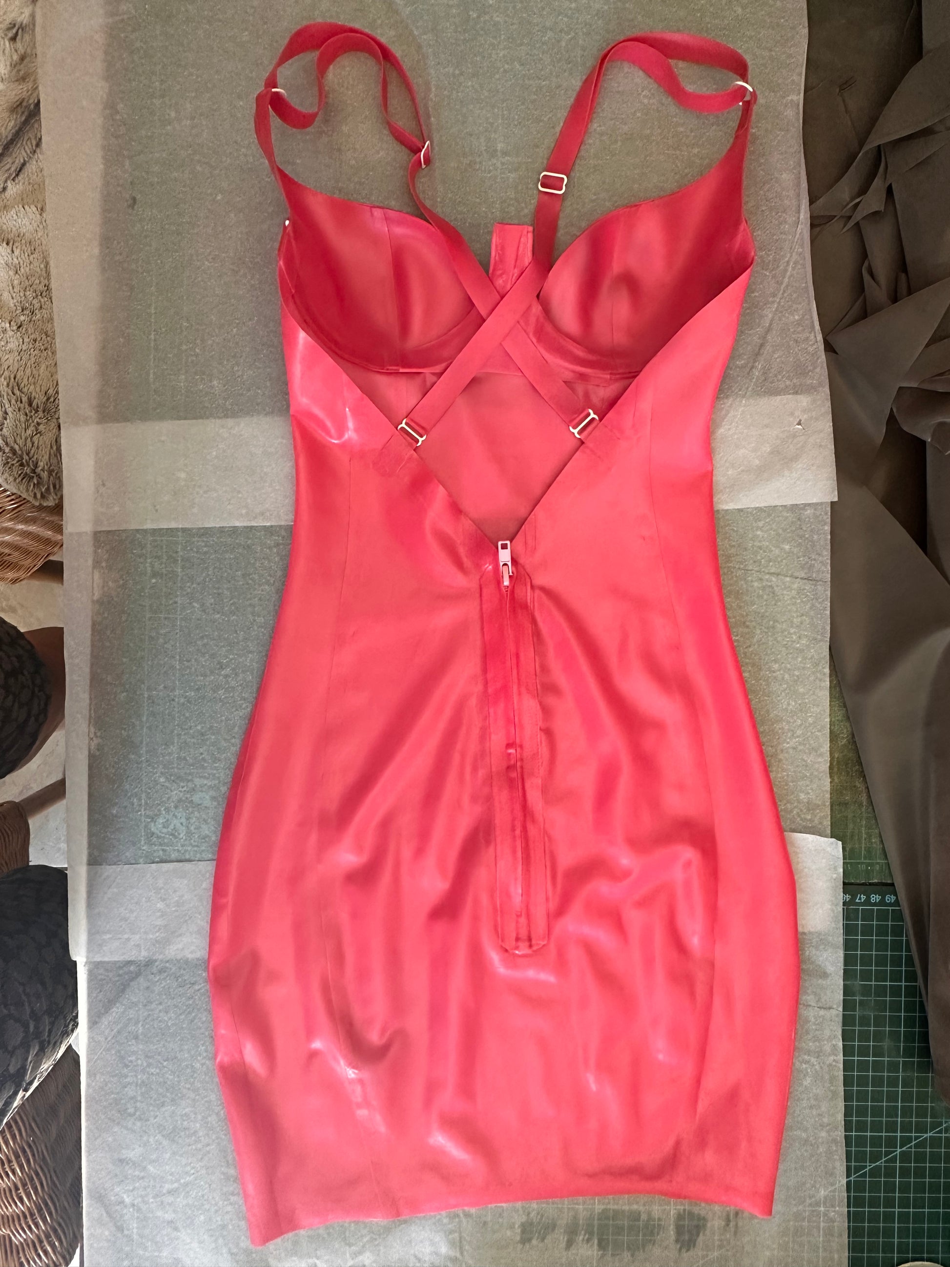 Photoshoot sample of the low back, curvy cup latex mini dress.