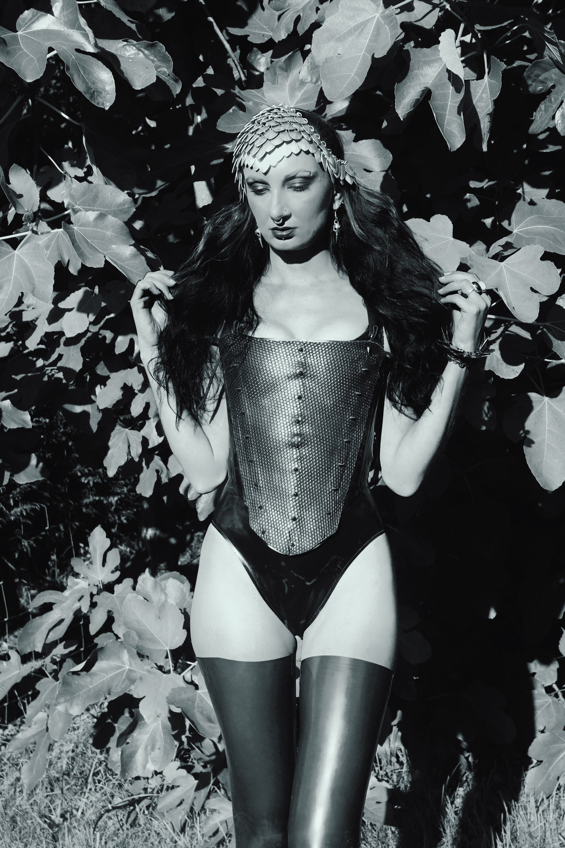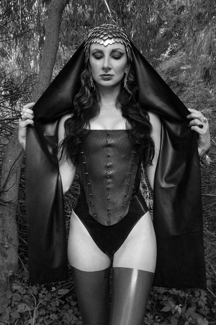 This panel is fitted with hook and eye tape that corresponds to that on the corset so it can easily be attached