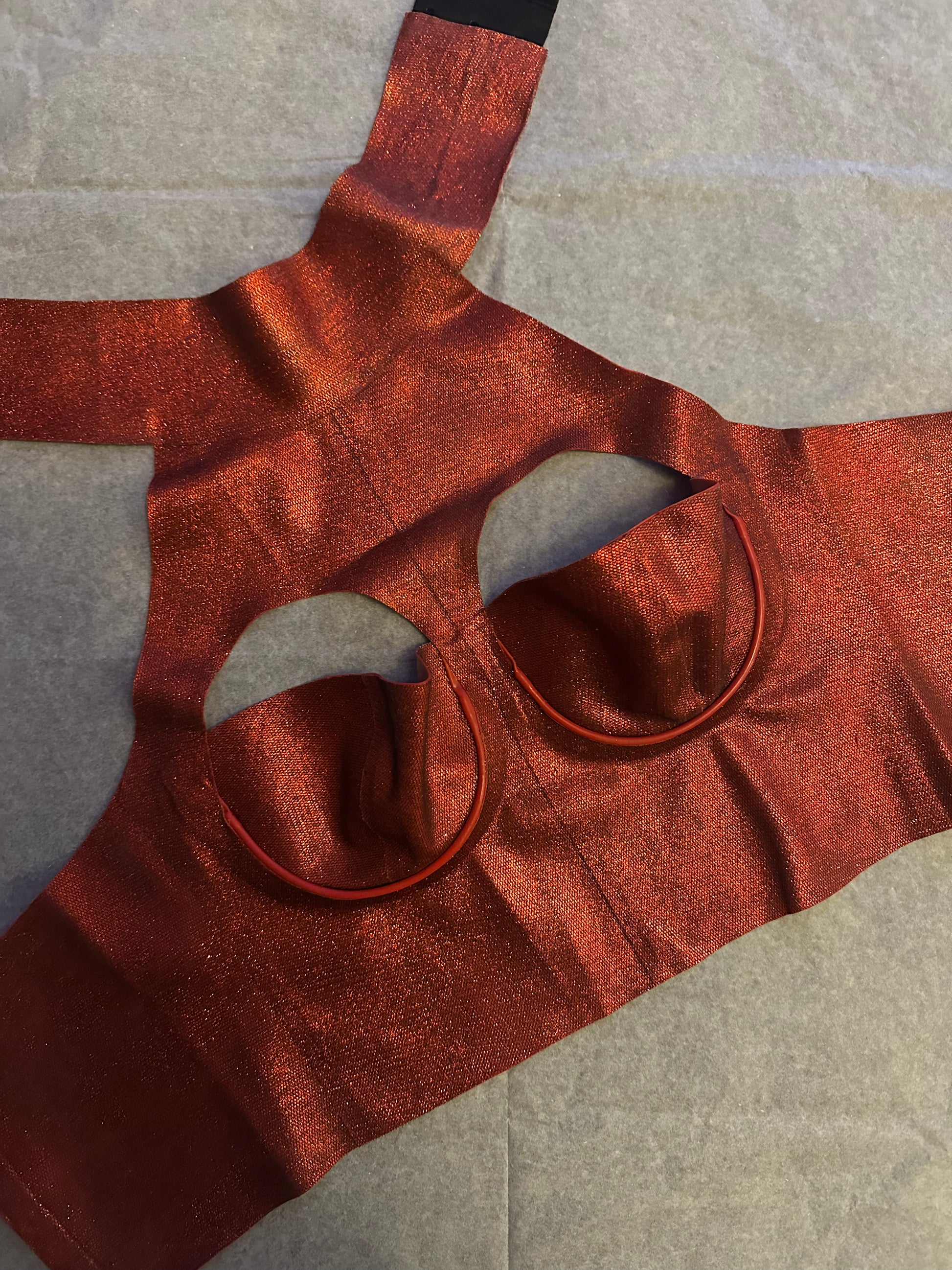 Red glitter-mesh latex cropped top with slightly adjustable back